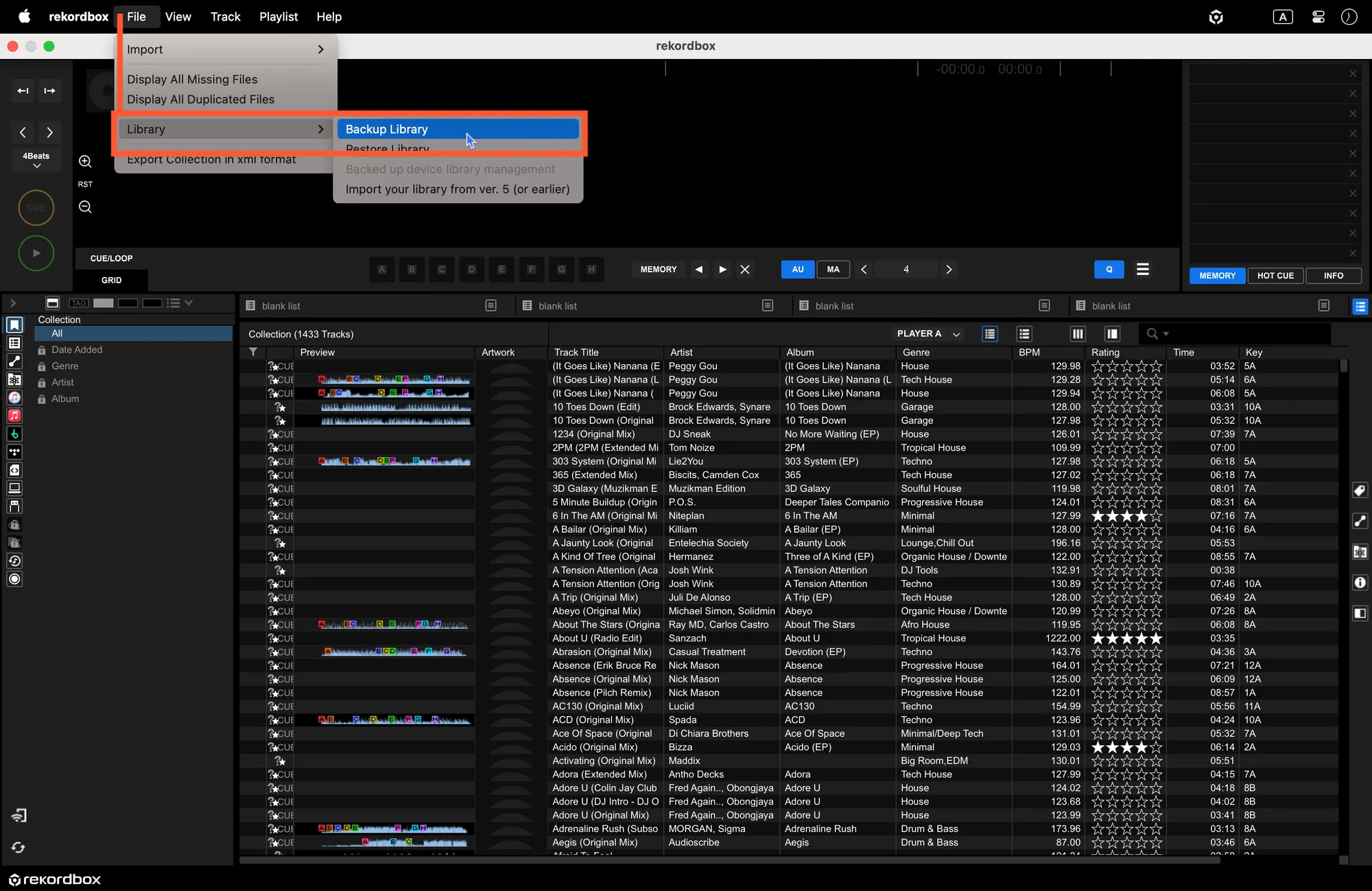 1. Open Rekordbox and select File -> Library -> Backup library from the top menu.