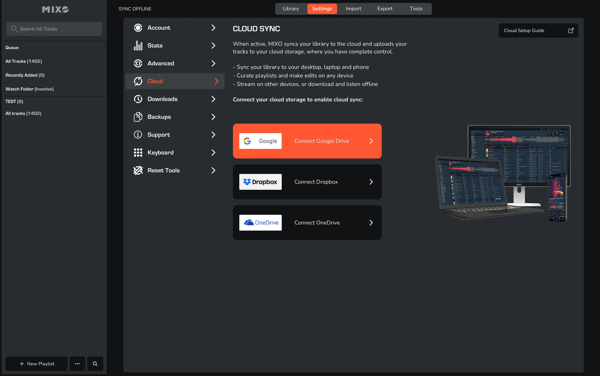 We recommend you use a NEW cloud storage account for your MIXO Music sync.