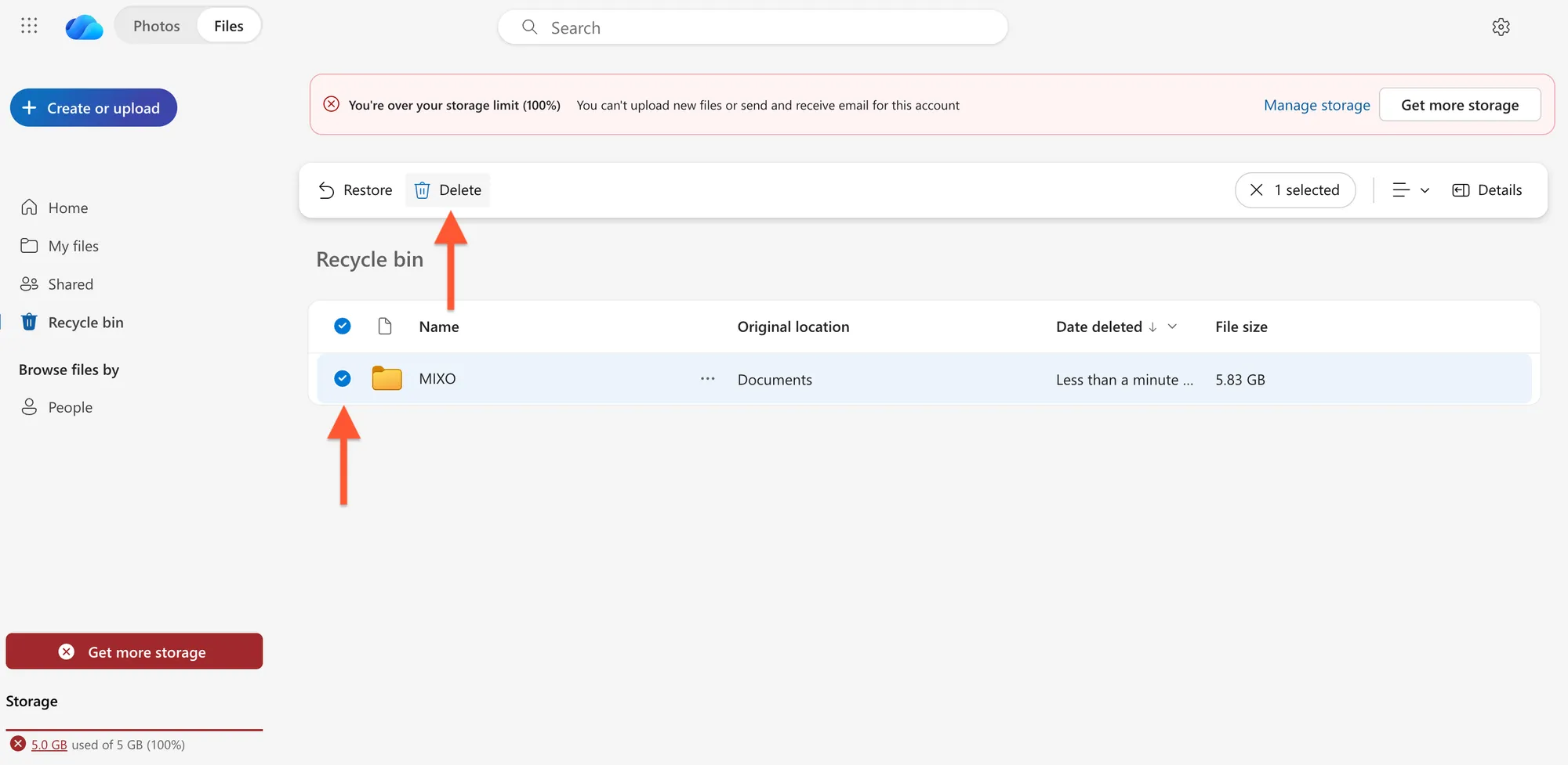 5. Go to the Recycle Bin and select the tickbox by the MIXO folder.