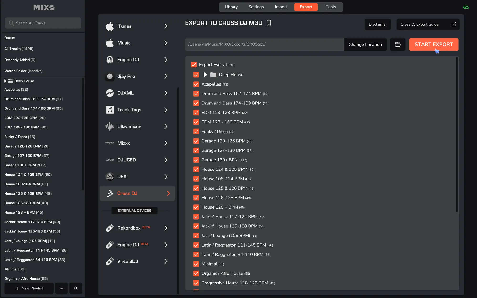 - Select whether to export your entire library or choose individual playlists and press the 'START EXPORT' button.