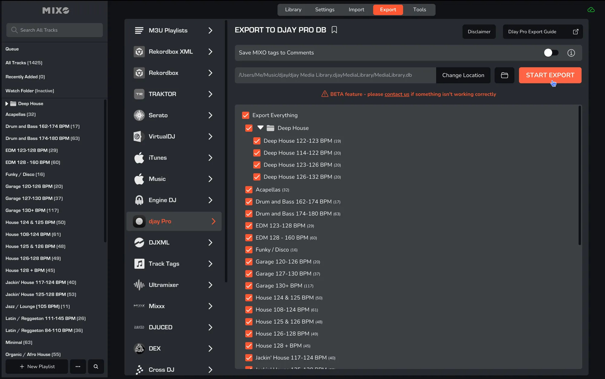 - Select whether to export your entire library or choose individual playlists and press the 'START EXPORT' button.