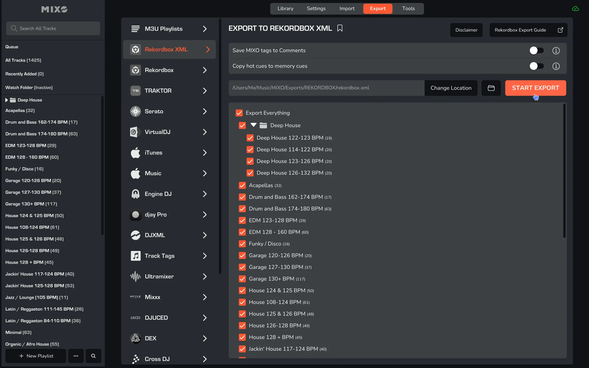 - Select whether to export your entire library or choose individual playlists and press the 'START EXPORT' button.