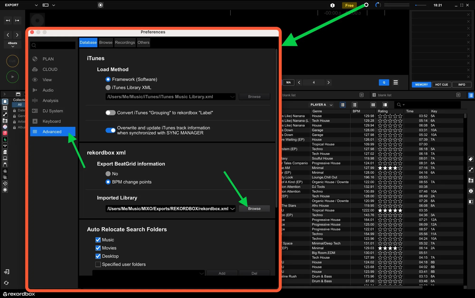 - Change the Rekordbox XML Imported library path to: MUSIC -> MIXO -> EXPORTS -> REKORDBOX and select rekordbox.xml.