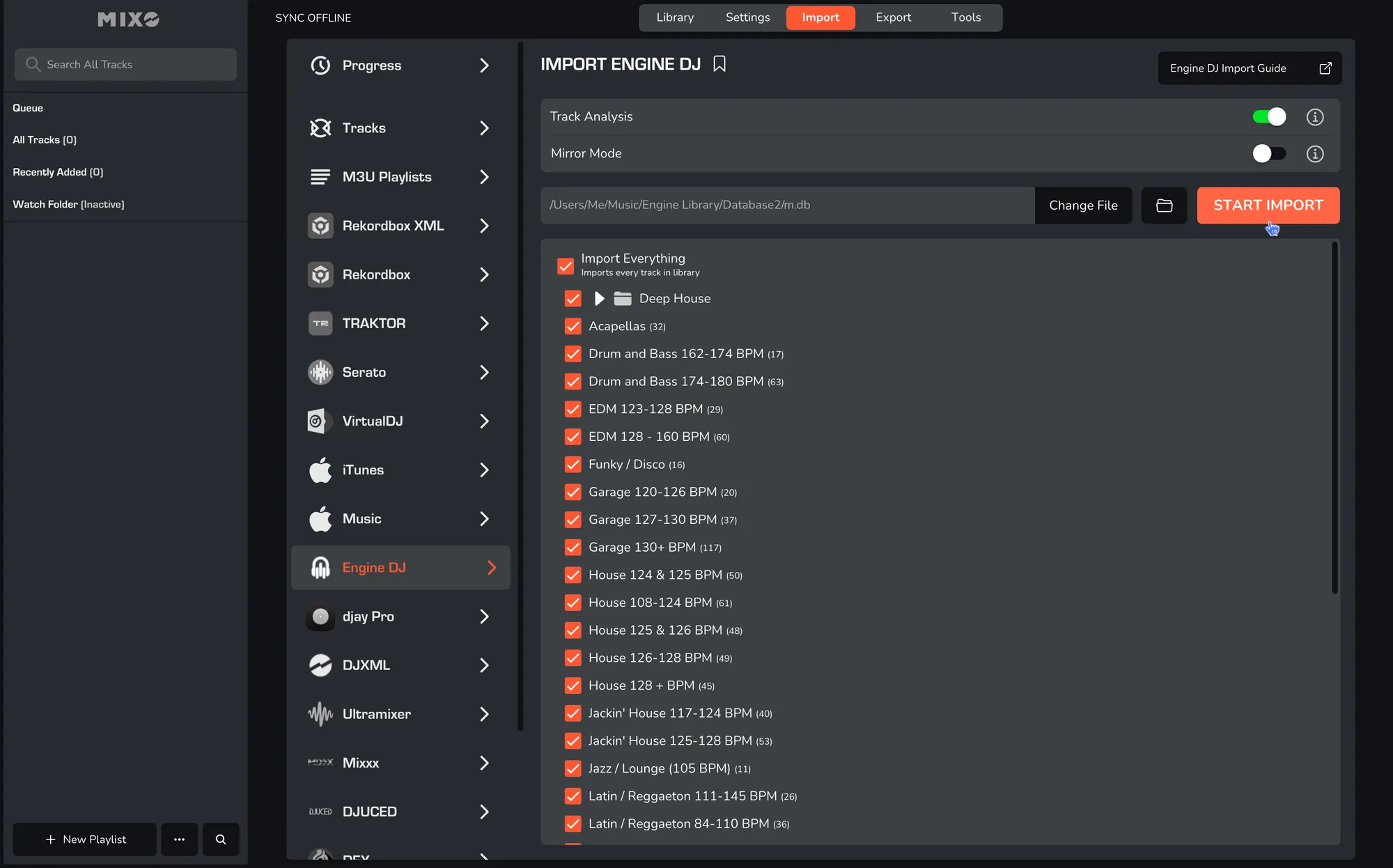 - MIXO should automatically locate your Engine DJ library. If it does not, use the 'Change File' option to manually select the database file.