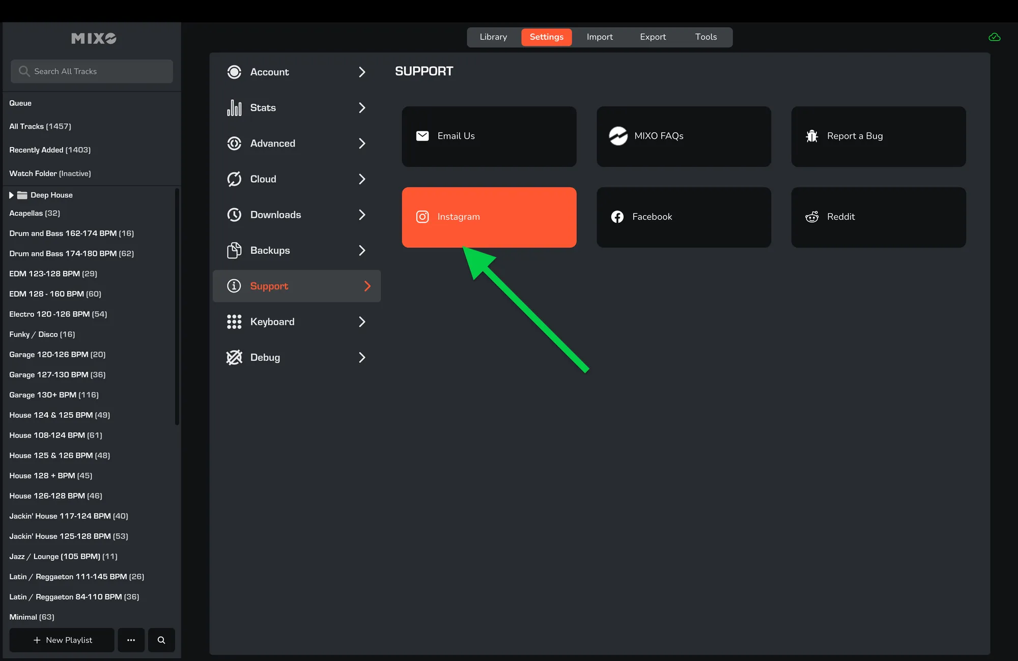 If you want to follow us on Instagram and stay up to date with MIXO’s newest features, updates, and general news, you can either look us up directly or alternatively head to Settings -> Support -> Instagram.