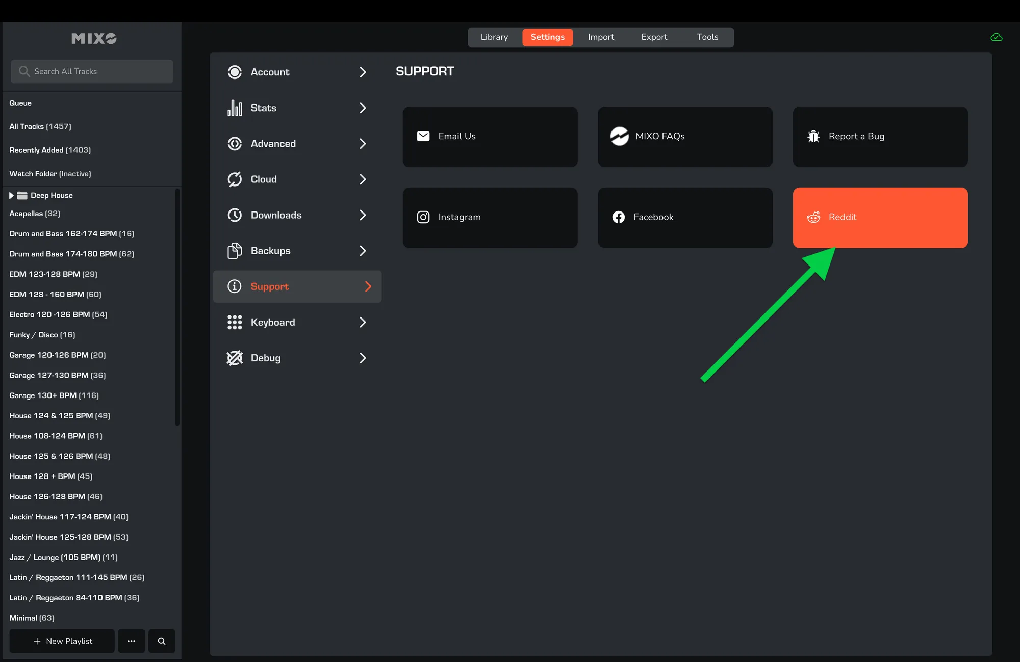 To follow us on Reddit and stay up to date with MIXO’s newest features, updates, and general news, you can either look us up directly or alternatively head to Settings -> Support -> Reddit.