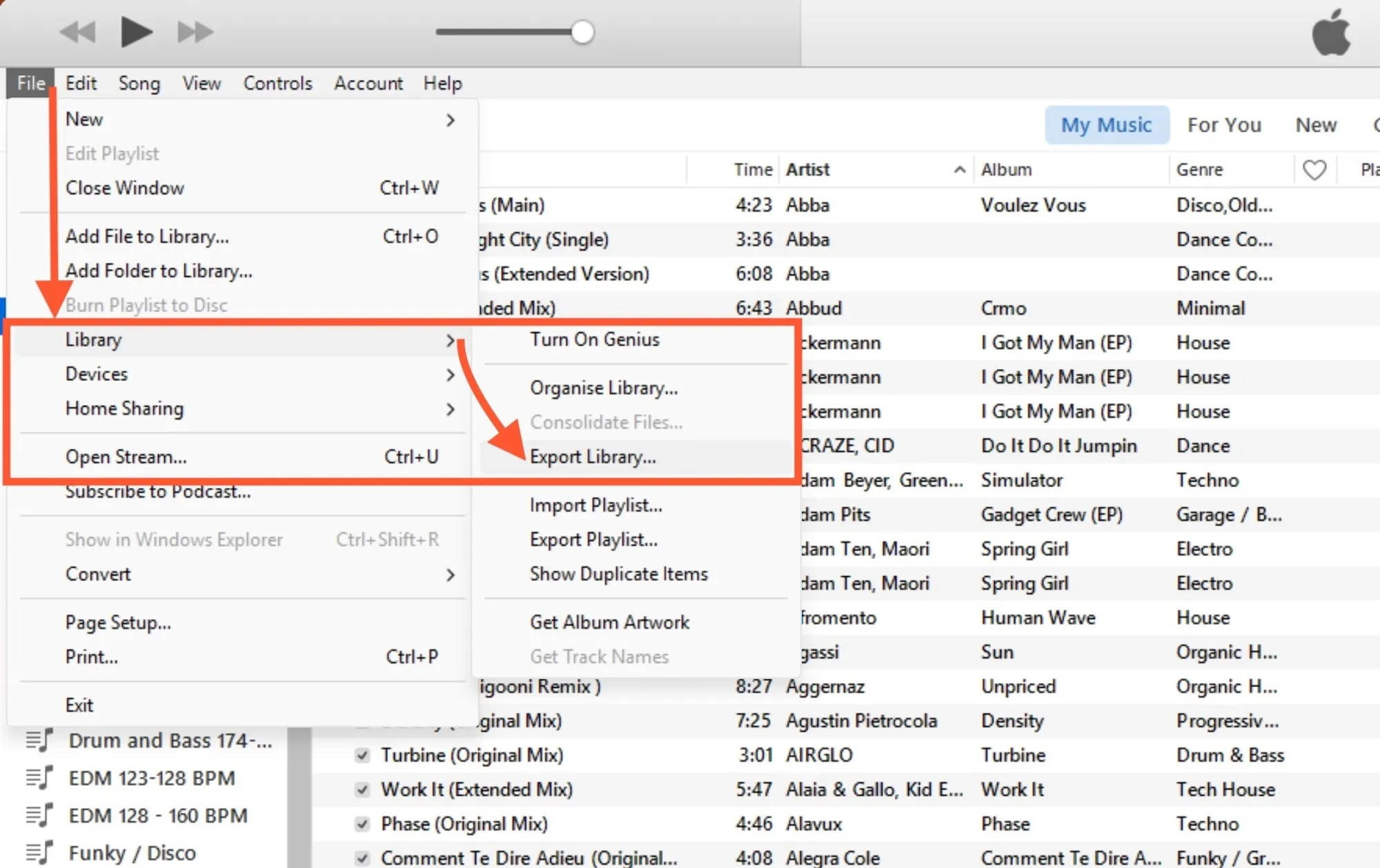 - In the top menu bar, navigate to File -> Library -> Export Library...
