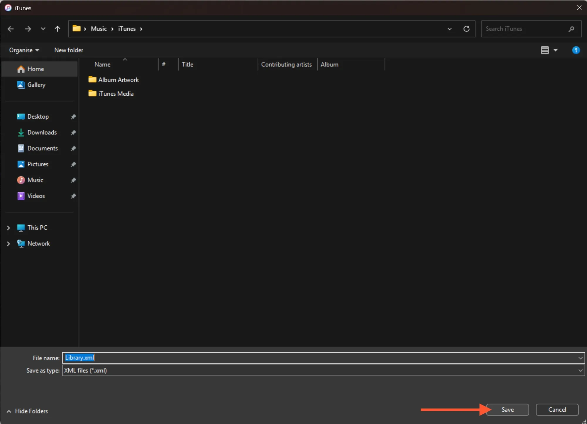 A window will open asking you to save the file. Choose a memorable location for the file. The file will be saved as an XML file (e.g., Library.xml).