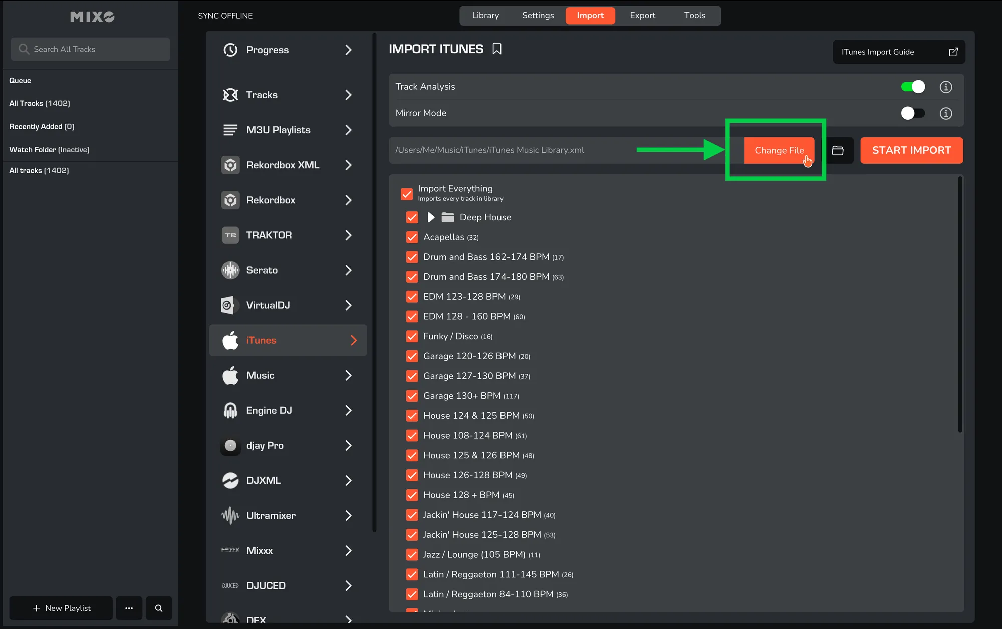 - If MIXO doesn’t find the XML file automatically, look for the file selection area and click the 'Change File' button.