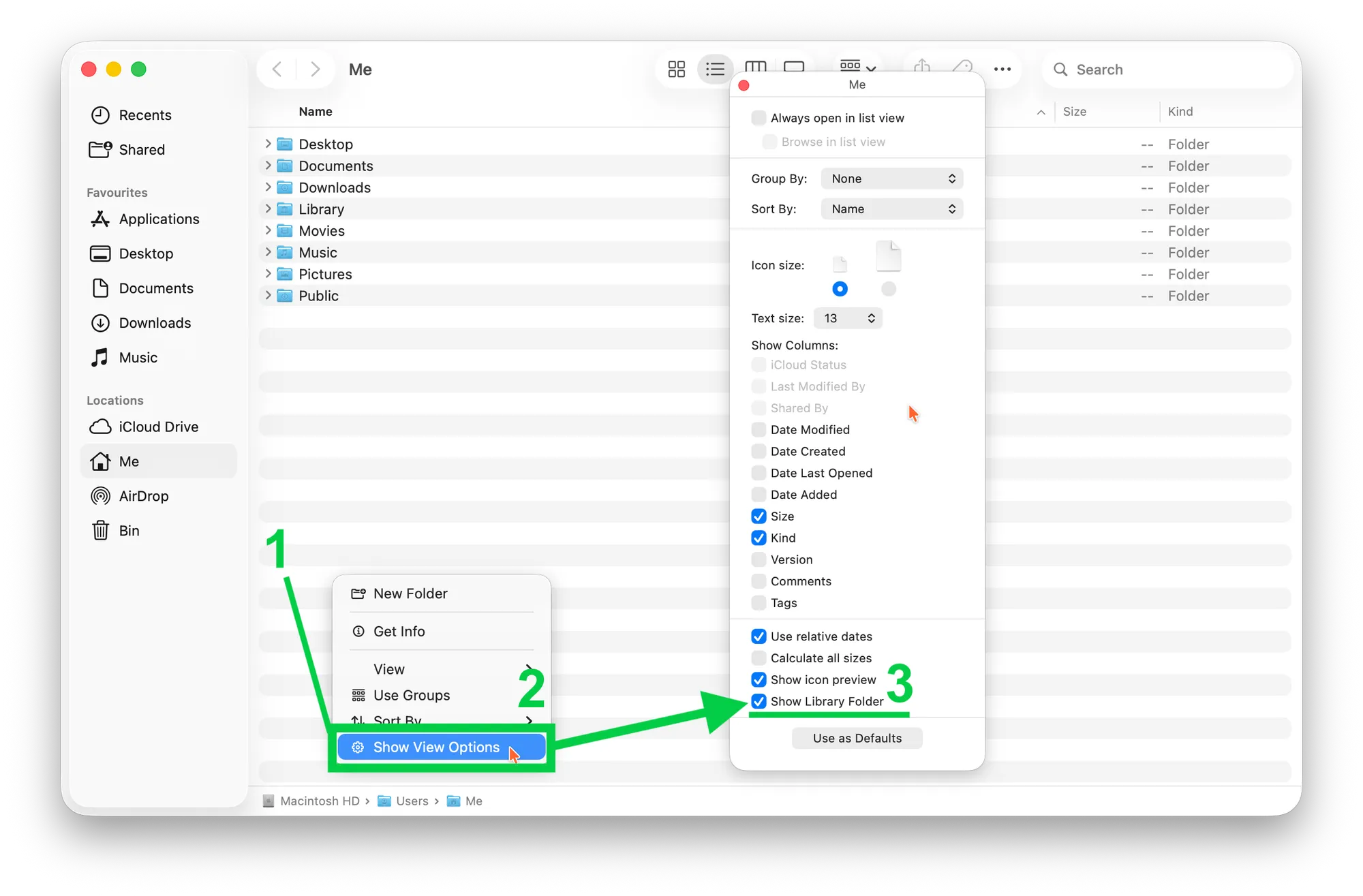 - First, ensure the Library folder is visible: Finder -> Right-click -> ‘Show View Options’ -> tick ‘Show Library Folder’).
