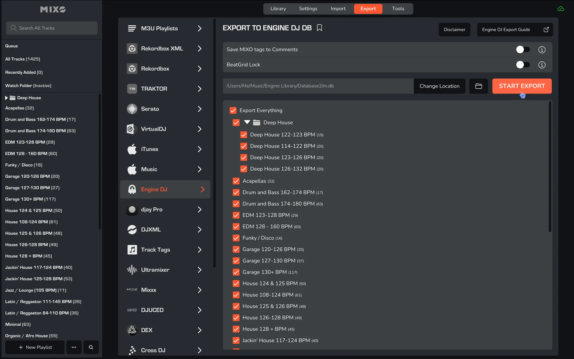 - MIXO should automatically locate the Engine DJ database. If it has been moved, use the ‘Change Location’ feature before exporting.