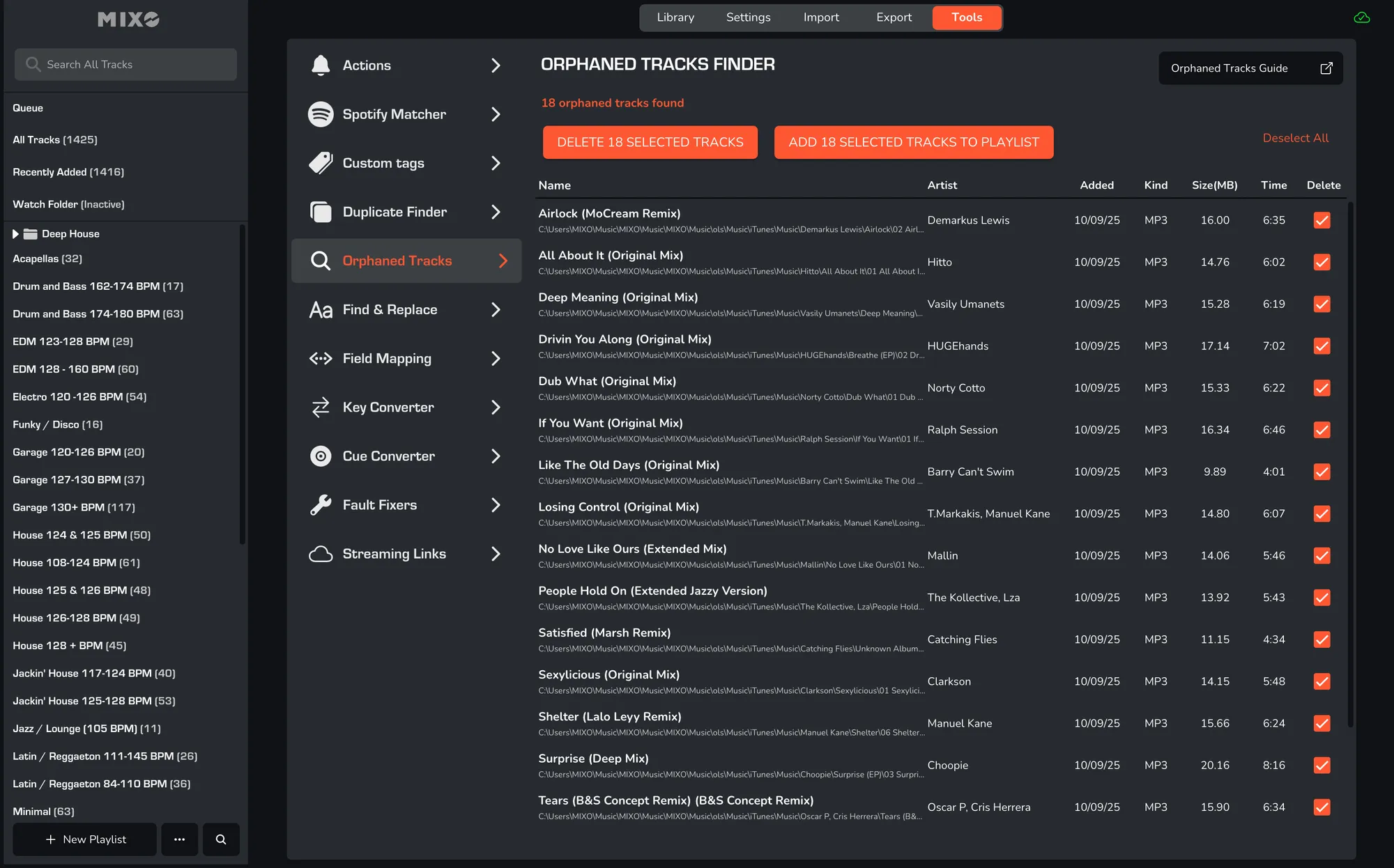 The Orphaned Track Finder is a useful tool for clearing out old tracks that do not exist in any of your carefully curated playlists in MIXO.