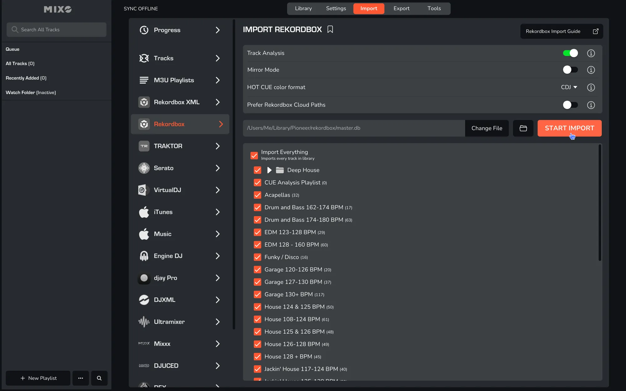- MIXO should automatically locate your Rekordbox library. If it does not, use the 'Change File' button to manually select the Master Database file.