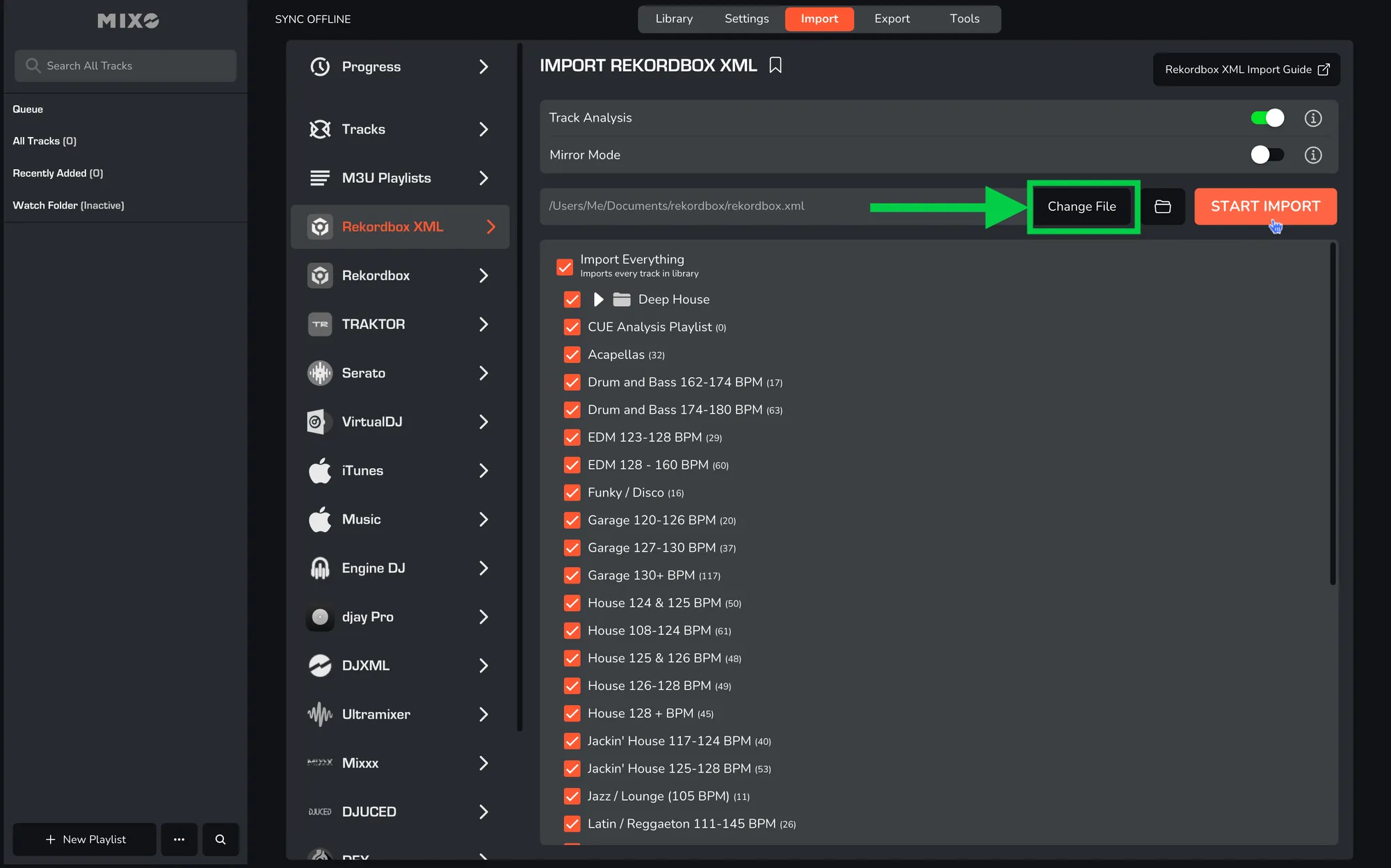 - Click the 'Change File' setting to load the Rekordbox XML file that you just saved.