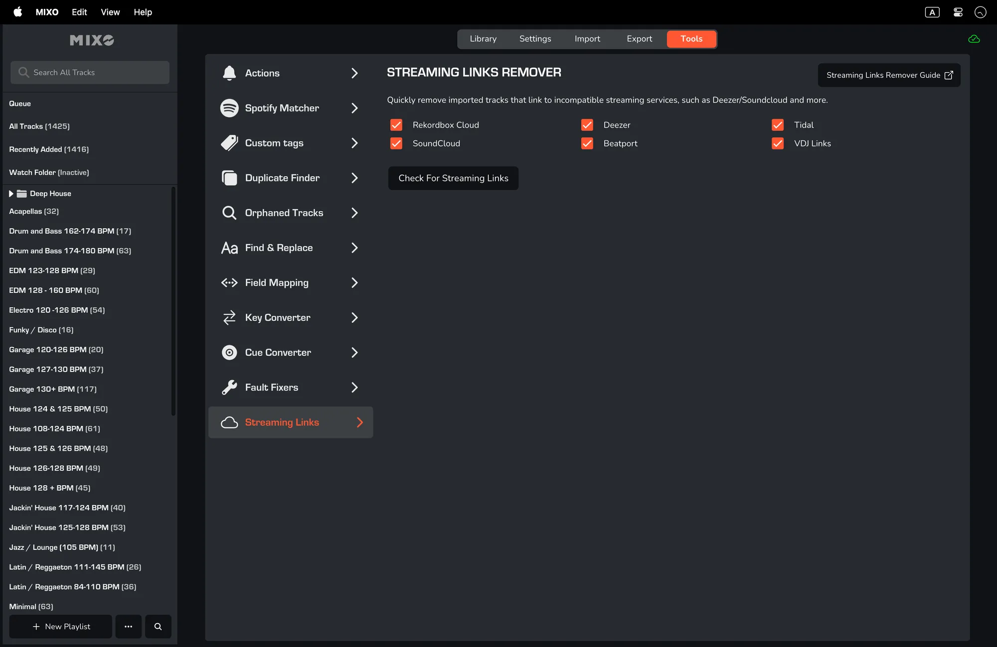 The MIXO Streaming Links Remover tool allows you to remove tracks that link to streaming services such as Rekordbox/SoundCloud/Beatport/Deezer/Tidal and VDJ 'Online Music'
