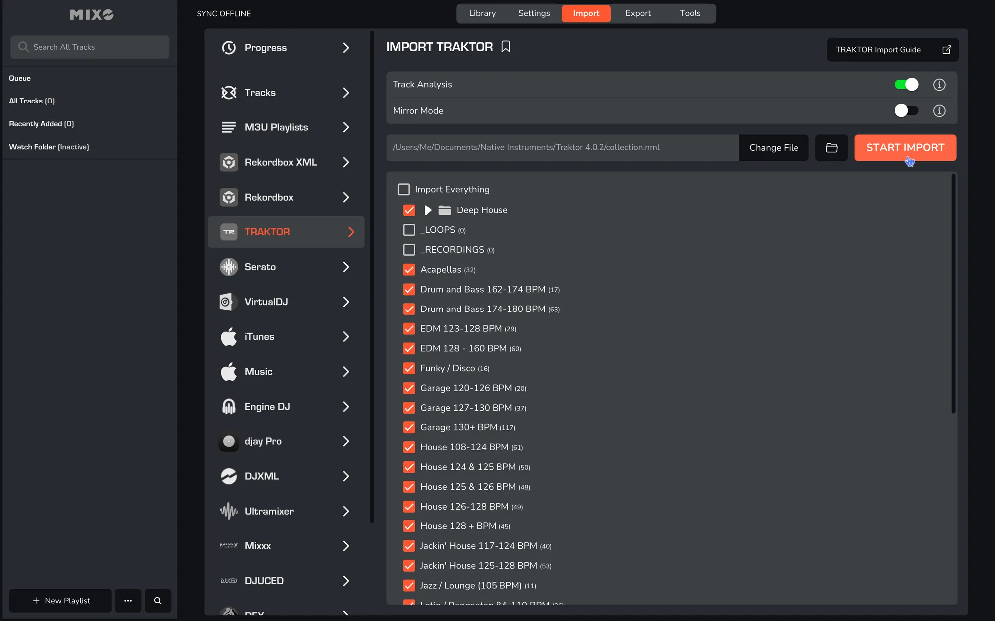 - MIXO should automatically find your Traktor library. If it does not, use the 'Change File' button to manually select the database NML file.