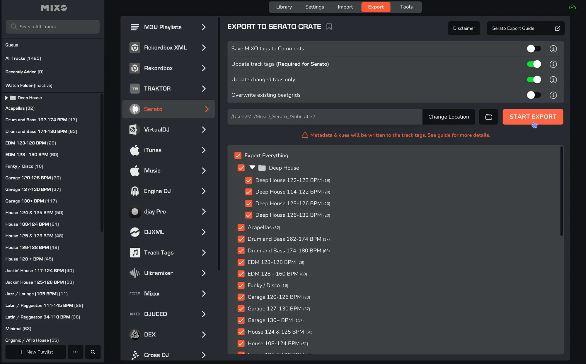 - MIXO should automatically locate the directory Serato creates. If it has been changed, use the ‘Change Location’ feature before exporting.