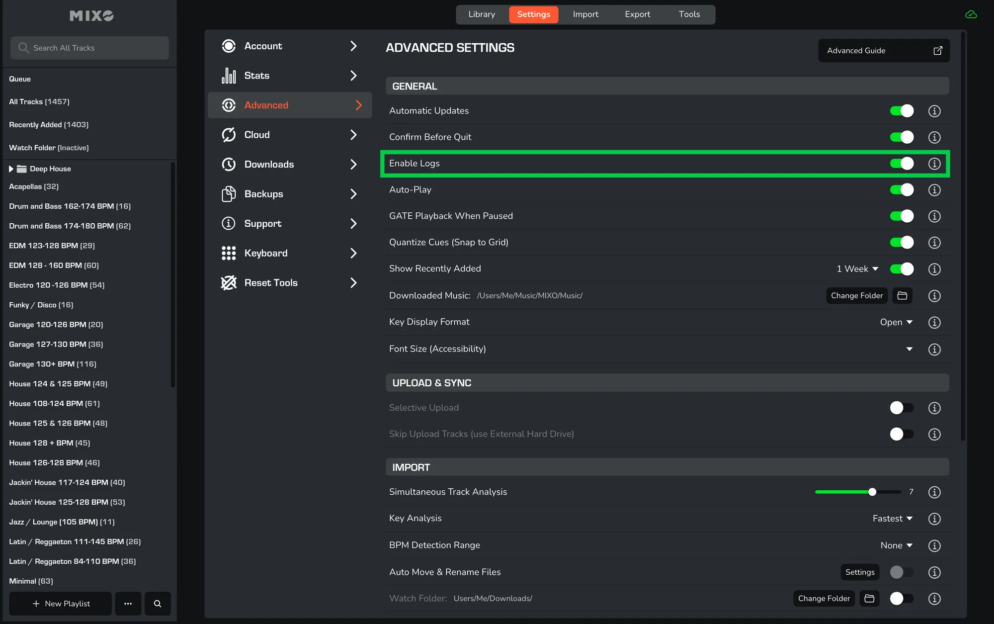 Turning on logs will generate logs in the MIXO folder with information about different events.
