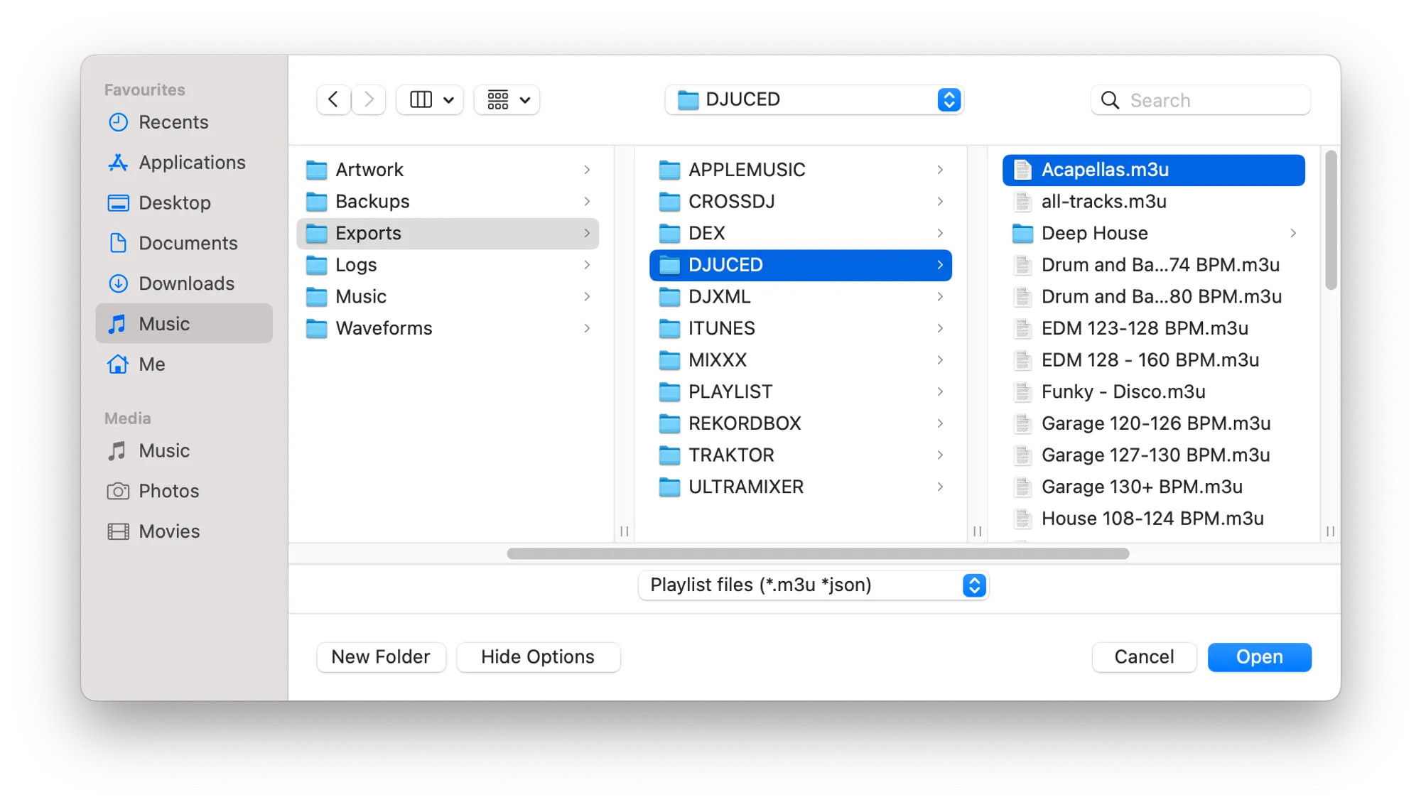 - Browse to the folder MUSIC -> MIXO -> EXPORTS -> DJUCED and select the M3U playlist file you want to import.