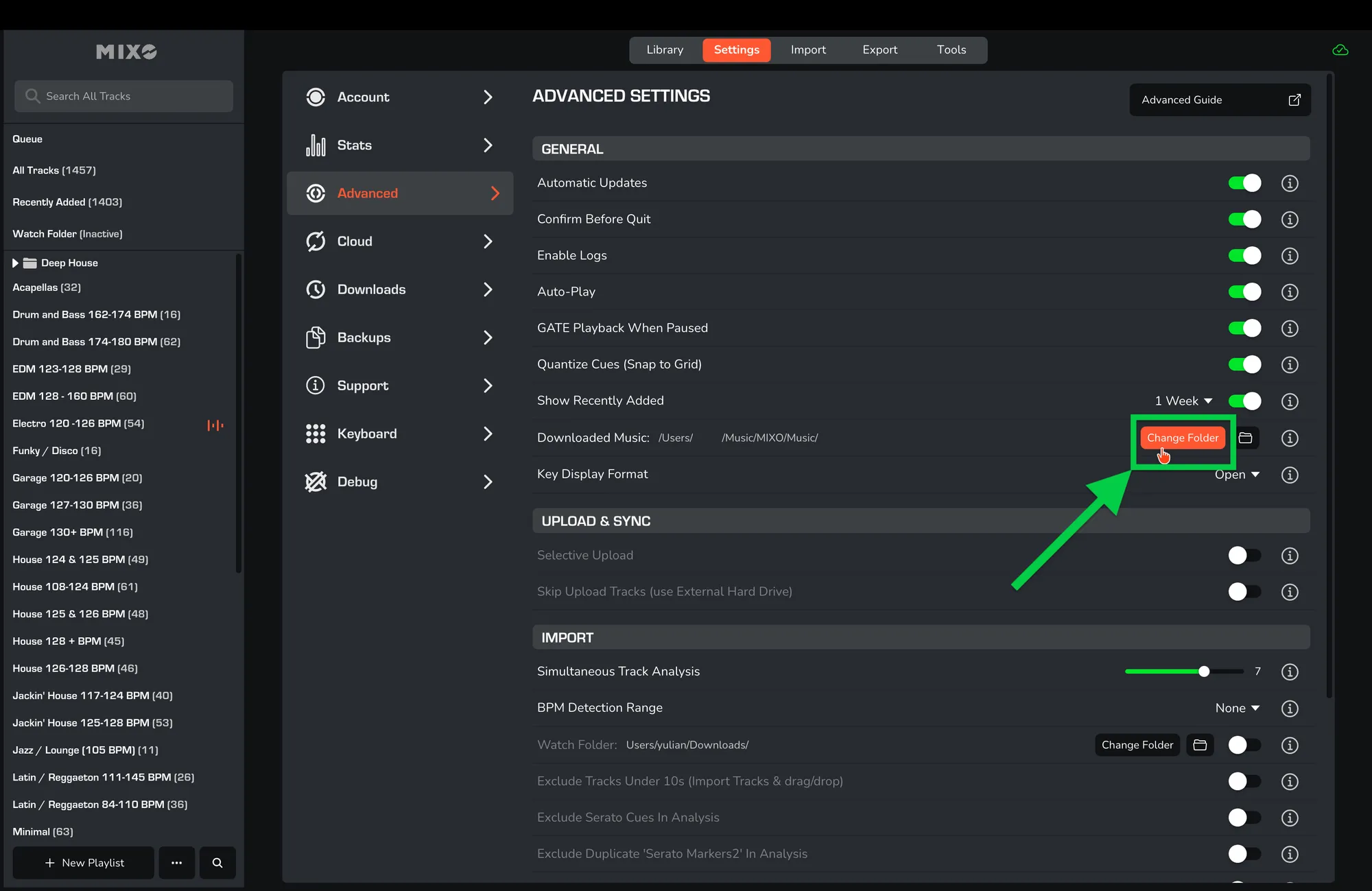 - To edit the location for downloaded tracks on your computer/laptop, navigate to MIXO -> Settings -> Advanced -> General -> Downloaded Music -> ‘Change Folder’.